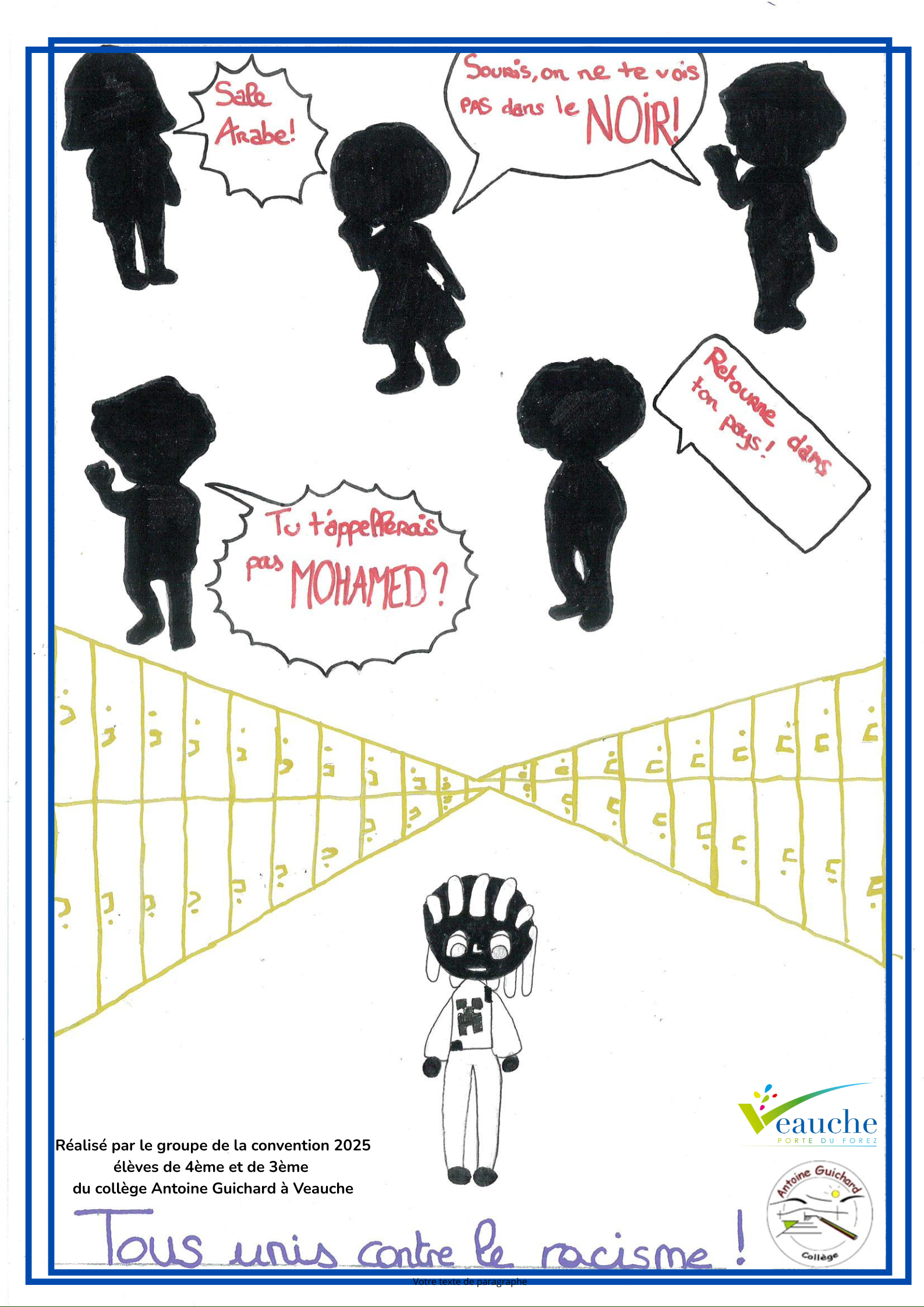 Dans le cadre du partenariat entre le Pôle Enfance Jeunesse de Veauche et le collège Antoine Guichard, plusieurs groupes d'élèves volontaire ont travaillé sur les thématiques du racisme et des dégradations durant l'année scolaire 2024/2025.